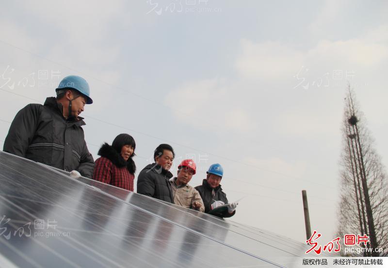 2014年2月11日,国网庐江县供电公司工作人员在白湖镇裴岗社区柳屋村民组杨克东家现场查看表计,并登上楼顶对光伏发电设备进行安全检查。